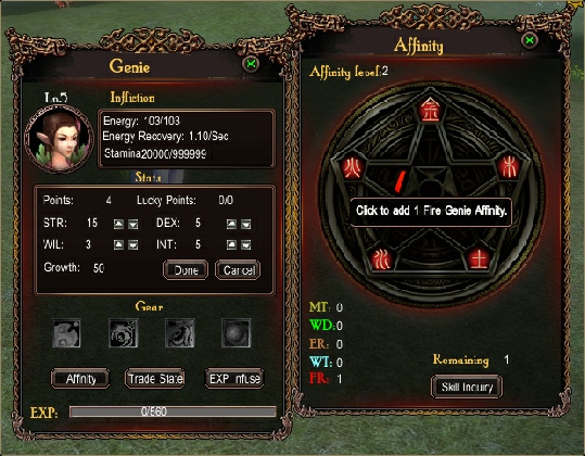 estadísticas base, los jugadores pueden mejorar la afinidad elemental de un Genio, con cualquiera de los cinco