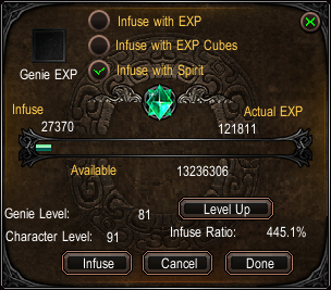 Nota: La ganancia de EXP del Genio aún está sujeta a las reglas de proporción de infusión de EXP.